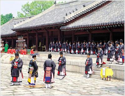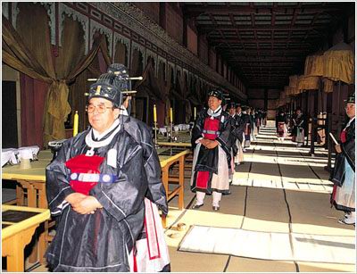 进入宗庙正门后,有三条路,中央稍高一些的路是为去世的国王所设,东边的一条是国王,西边的一条是太子行走的。中间的路直连正殿。两边的路则连接到沐浴、斋戒及准备祭祀的房间。国五和太子在洁身净心后进入曲祀厅。 这里是准备祭祀用食物的地方,中间有院落,整个建筑呈“口”字形。宗庙的中心是正殿,这里是供奉历代国王的牌位及举行祭祀的地方。