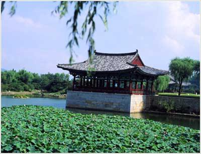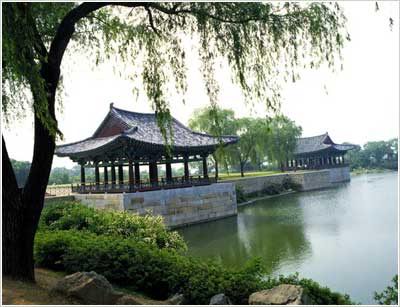 雁鸭池即是当时挖出的莲花池,位于月城(AD101年建造的新罗时代的城)外侧东北部。据1974年挖掘时的调查结果,雁鸭池呈球形,东西200米,南北180米,有大小不等的3个小岛。目前的雁鸭池接近圆形,是沿护岸石重新修建而成的。 本是新罗王宫的离宫,曾作为东宫(皇太子或王位继承人居住的宫殿)。之所以被称为临海殿址是因为过去史书中临海殿出现次数最多。最初挖掘出土时,发现宫殿的