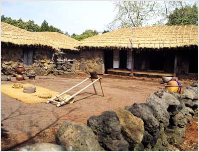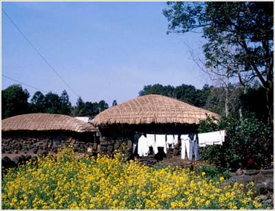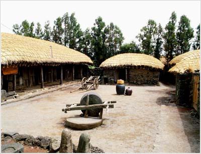 城邑民俗村由于位于济州岛上,因而也完全反映了济州岛独特的居住文化。你在这里可以看到那看似堆得稀稀疏疏的挡风石墙(黑熔岩石),为了防止风直接进入里屋而建得又直又弯的“奥来”(窄胡同),还有成为济州岛之象征的石神像(Dolharubang)。 |