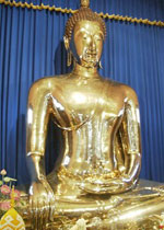 ![]() 金佛被发现的年代大约在七百多年前,据说佛寺所在地本来颇为荒凉,后来华人逐渐聚居。他们把扔在荒山上的一个无人肯要的佛像雇车搬了回来,搬运时,佛像可拆卸成9节。几经周折,运抵寺庙后,佛身有一块铁壳掉下,露出里面金光闪闪的金佛像身。把所有铁壳敲掉后,金光闪亮的完整佛身露了出来,因此名闻全国,后定名该寺为金佛寺。