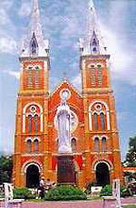 胡志明市圣母大教堂,因使用红砖建造,又称红教堂,是胡志明市最著名的地标。 教堂建成于1883年,为法国殖民时期留下的纪念品。建筑造型匀称,庄严宏伟,两座40米高的钟楼塔尖直冲云霄,是仿照巴黎圣母院钟楼的设计。建造教堂的红砖全部从法国运来,至今没有丝毫褪色。在教堂前面的花园广场上,伫立着一座重达4吨的圣母玛丽亚雕像,那是1945年罗马教会所赠。 教堂外部门廊等部位