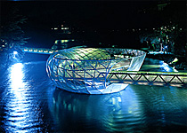 岛内有室外半圆型剧院(露天表演场)、儿童娱乐场所与咖啡馆,咖啡馆以银、蓝色系搭配不规则状的金属桌椅,