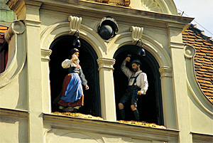 有一栋墙面绘有金*壁画的钟楼,它建于1903年,每天11:00和下午15:00、18:00,屋顶上的音乐钟楼会播放音乐,接着窗户就自动打开,出现一对身穿传统服饰的木偶随着音乐翩翩起舞,最后,一只金鸡探出头来鸣叫三声方告结束,十分可爱有趣。这处广场也是咖啡馆、酒吧、餐厅的聚集处,非常热闹。 |