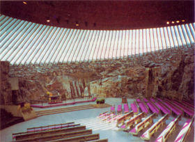 岩石教堂是几乎所有造访赫尔辛基的游客的必游之地。这座闻名欧洲的教堂是从一整块岩石中开凿出来的,由著名设计师 Timo 和 Tuomo Suomalainen 设计,1969年完工。站在教堂外,映入眼帘的是一块巨大的岩石,看不到一般教堂所具有的尖顶和钟楼,只有一个直径20多米的淡蓝色铜制圆形拱顶暴露在岩石的最上面。教堂的屋顶由100条放射状的梁柱支撑,同时镶嵌透明玻璃,丝毫感觉不到身处地下。内部墙面仍为原有的岩石,入口设计成隧道。教堂的正厅可以容纳约 750