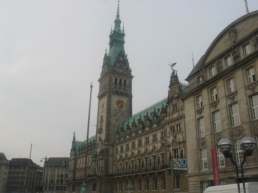 市政厅(Rathaus)从1886年开工,费时11年才建成,是十九世纪后半期建成的新巴洛克式风格的建筑物,建筑上装饰着不少富有纪念意义和象征作用的艺术品。整个大厦用砂岩砌成,除屋顶为铜绿色外,外观呈烟灰色,古朴而典雅。 市政大楼中央的尖塔高112米,是汉堡市最瞩目的建筑物之一。钟塔上安装着镀金的帝国之鹰,它是德意志统一的象征。市政厅规模宏