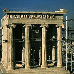 景区介绍 雅典娜胜利女神庙位于山门右侧。神庙建于公元前449-前421年,采用爱奥尼亚柱式,台基长8.15米,宽5.38米,前后柱廊雕饰精美,是居住在雅典的多利亚人与爱奥尼亚人共同创造的建筑艺术的结晶。