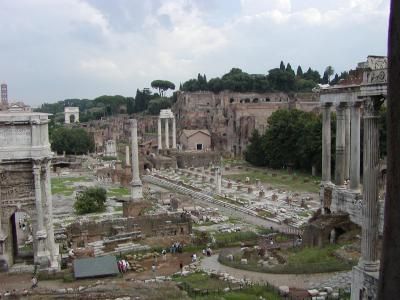 威尼斯广场到大圆形竞技场之间巨大的罗马广场(Foro Romano),曾经是罗马时代市民生活的中心。 从皇家法院大街过去,右侧排列着的圆柱就是艾米乌斯的长方形大会堂。公元前179年建成,人们曾经把这里作为金融中心进行过商业交易。公元410年西哥特人占领罗马时发生了火灾,当时烧溶化的货币的遗迹现在仍然残留着。西面砖砌的四层建筑物是元老院