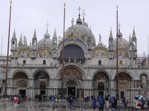 景区介绍 雄伟壮丽的圣马可大教堂始建于829年,重建于1043-1071年,它曾是中世纪欧洲最大的教堂,是威尼斯建筑艺术的经典之作。据说其中埋葬了耶酥门徒圣马可而得名。圣马可是圣经《马可福音》的作者,被威尼斯人奉为护城神,其坐骑是狮子,当威尼斯摆脱拜占庭的控制,成为一个城市共和国后,元老院决定圣马可为城市的新守护神,以代替狄奥多尔,所以威尼斯的城徽是一只巨大的狮子抱着福音书。