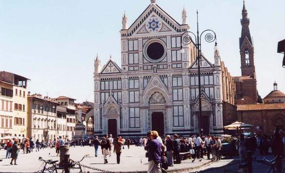 景区介绍 这座大教堂面向富有情趣的佛罗伦萨最古老的广场,旁边附属的僧房庭院与布鲁内莱斯基建造的帕兹家族礼拜堂构成的空间具有无可比拟的美,被称为是佛罗伦萨文艺复兴建筑的浓缩。景区概况 面积为 140m x 40m的教堂内部有被这个城市驱逐、死于拉文纳的但丁的纪念堂以及米开朗基罗、玛恰威里、罗西尼等276人的墓。与这些人相应的是内部的装饰也出自许多艺术家之手。其中最出名的有走廊右侧第5根廊柱上德纳特罗