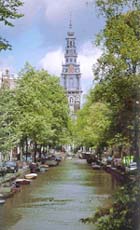 韦斯特教堂位于韦斯特市场附近,她的钟楼是阿姆斯特丹的标志,在这座50米高的钟楼上,可以俯瞰旧城美丽且富于历史韵味的全景。 17世纪的荷兰地图与航海图都以该教堂的南北轴为零度经线(1884年,格林威治起始子午线才被所有国家承认)。伦勃朗于1669年在附近的罗森水道旁去世,他被葬在教堂中堂下的穷人墓室中。荷兰最有名的杜松子酒酿酒