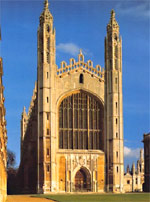 学院内的国王学院礼拜堂(King's College Chapel)是剑桥古建筑的典型代表,由亨利六世亲自设计,耗时近100年才于1547年建成完工。礼拜堂的扇形拱顶天花板以22座扶壁支撑,1515年由名匠瓦斯泰尔建造;西门上的皇冠与都铎蔷薇的纹章细节,反映出亨利八世的英国霸权梦想;墙壁上的16世纪彩色玻璃窗都是以圣经故事为主要情景。礼拜堂中的屏隔是都铎式木工的绝佳典范,分隔前厅和诗席班,屏隔上方巨大的17世纪管风琴箱饰有两尊手持喇叭的天使。祭坛后还有一幅装饰画,为1634年鲁本斯为比利时白衣修女修道院所绘的“贤士来朝”(The Adoration