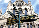 约克大教堂(York Minster)是英国最大的哥德式教堂。13世纪初开始动工,250年后才完成。教堂内拥有世界面积最大、以单扇窗镶嵌的中世纪彩绘玻璃和世界最古老的侧廊。教堂东面一整片的彩色玻璃,面积几乎相当于一个网球场的大小,玻璃染色、切割、组合工艺一流。教堂内还有一些如小天使、封建时代的盾牌和龙头的小收藏。 参观教堂最好选择约克大教堂举行晚祷的时间,在唱诗班优美歌