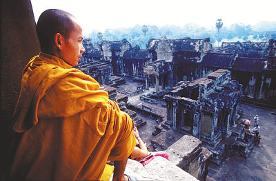 吴哥窟有着数不清的寺庙、城堡、宫殿与花园,经过近千年的风雨,那些建筑大部分已是残垣断壁。如今,保存最为完整的寺庙就剩下小吴哥(AnkorWat)。吴哥窟是吴哥建筑群的最精华部分,同时也是吴哥乃至柬埔寨的代名词,而今,柬埔寨人把它印制在国旗上,作为国家的象征。 坐在台阶上的西方游客在东方神秘氛围里沉思。