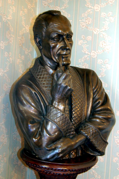 这时,来了一位急性子客人,他很绅士轻给门卫鞠一躬问道:“先生,请问这是福尔摩斯先生的家吗?”门卫笑呵呵地给客人还礼并回答说:“是的先生,不过福尔摩斯先生刚来了一批客人,正在楼上和福尔摩斯先生谈话呢,恐怕先生现在不能即刻会见您,您需要耐心等一会儿。”那位先生也很诙谐地笑着说:“那可是太遗憾了,不过我还是很乐意等他”。他们的对话让我觉得很好笑,过了大约五六分钟,门卫对大家说:“欢迎光临!福尔摩斯先生请你们进去做客!请进吧!”随着门卫的话音刚落,大家就迫不及待地去见这位大侦探了。