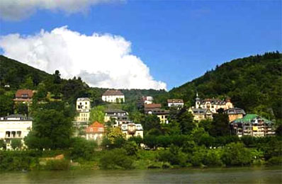 站在河边仰头四望,海德堡城市原来坐落在两山之间。一侧山腰上矗立着著名的古城堡,它建于十七世纪,是一位德国诸侯王为讨妻子欢心所建造的宫殿。这是一片巍峨的石筑宫殿,虽然有部分已经坍塌,但是斑驳的巨门高窗和褪色的雕梁画栋仍显示著它当年的风采。 去古堡参观需要登上高高的山岗,不知道别人是如何上去的,我想应该有缆车和公共汽车,但是当我望着那凹凸不平、却被人们的脚步磨得很光滑的石头路面,我却有了一步步爬上去的念头,的确,当年这条路上走的是怎样名声显赫的人物呢。 路面很陡,很窄,一路都是一排排风格各异又和谐统一的房子,房前还停着一辆辆的小车,这使得本身不宽的山坡小道更加狭窄。