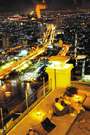 站在64层的楼顶上,湄南河畔万家灯火尽收眼底。 我在曼谷开始这活力的一天时,昼夜时间是颠倒过来的。到达曼谷的时候,夜幕已经降临,精彩的曼谷看点从夜色中流露。从机场出来,我们一行四人直奔市中心State Tower顶层最豪华的餐厅,去感受夜的魅力。当我们站在64层的楼顶上,整个城市的灯光像是为迎接我们这群客人而亮的,大家都被此情景震住了,不禁大声惊叹:太漂亮了! 站在餐厅开放式的露台上,感觉头顶天空,脚踩空中楼阁,曼谷及湄南河畔的万家灯火尽收眼底。据说,这里是看曼谷夜景最美的地方。站在这64层楼高的露台上,在满眼璀璨灯光和星星做伴的地方,自己就像站在了这个城市的最高点,人就这样被璀璨的霓虹灯簇拥着。