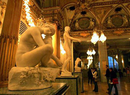 奥赛博物馆的收藏博大精深,共收藏近代艺术作品4700多件,内容涵盖绘画、雕塑、家具、手工艺品、建筑、摄影等几乎所有的艺术范畴。其中,最负盛名的 是19世纪下半叶精美的艺术收藏品。 奥赛博物馆的展品按艺术家的年代和流派分设在大厅的底层、中层和顶层。底层展出的是1850年至1870年的绘画、雕塑和装饰艺术作品,其中有安格尔、德拉克洛瓦、德加、莫奈、罗丹等的作品。中层陈列的是1870年至1914年的作品,其中有第三共和国时期的官方艺术、象征主义、学院派绘画以及新艺术时期的装饰艺术作品。顶层集中展示的是印象派以及后