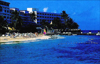 接下来,我们前往著名的唐氏瀑布(Dunn's River Falls),这是一个600英呎高的瀑布,由多个水流组合而成,终点是流到加勒比海,最有趣的是,其中布满许多岩石,可由下攀爬而上。 我们先到瀑布下面的海滩,享受一下加勒比海的海水,只不过,牙买加的海滩不是很干净,多少破坏了美丽的海景。