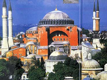 教堂前部是一个华丽的庭院,周围有柱廊环绕,中央是水池。经过三联门便到了外前廊,其后就是宏伟的大前廊,分为两层,下层为新教徒与忏悔者使用,上层为教堂游廊的一部分。平面组合的正中为正方形,边长32.6米,周长183米,宽7.6米的大石柱筑起拱圈。上承托四个半圈,以支托大圆顶。大圆顶高15米,直径为32.6米。旁附两个半圆顶,中殿是椭圆形。该段最初因施工匆忙,穹顶曾一度倒塌,修复时增加了扶壁。但后人仍可从中了解到,它的结构成就和匠师对结构受力