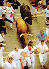 然而不知道会发生什么的恐惧,其实比事情发生时更叫人忐忑不安。整条跑道约1公里,如果顺利的话,过程其实也只约4分钟。如果有公牛离群,就会拉长整个过程,而离群的公牛,最具有杀伤力,因为它和你一样害怕彷徨无助。 当然你也能选择不跑完全程,沿途有不少特设的出口,让你随时撤退,如果你够敏捷,还能跳上窗户,攀上街灯等。 还有10分钟 海明威写活了这场刺激的游戏,才吸引了来自世界各地的游客。 参加者已经开始鼓噪。 奔牛节起缘于16世纪,与西班牙的斗牛传统有关。由于把愤怒的公牛由牛棚送到斗牛场太过困难,所以就划出一条路线,让公牛自己奔到目的地,后来人才加入这场游戏,和生命开一场刺激的玩笑。狂奔的公牛,如果知道死亡在尽头等着它,还会不会不顾一切地往前冲?或许一些生命总没有选择,它注定要成为人类的游戏伙伴,它们的存在是为了让人觉得快乐唾手可得,一切都在掌握之中。在