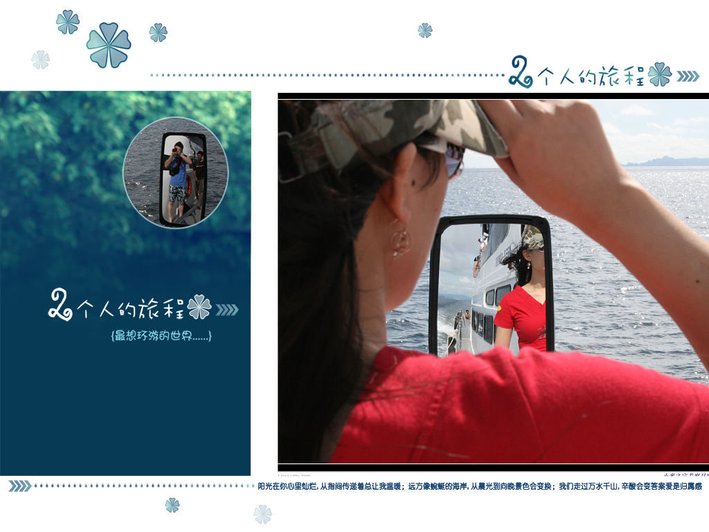 船很大,船舱分上下两层,行李都放在底层的楼梯下面。以免因为海浪大船颠簸而砸到人。船上有free的小点心和饮料。很多老外都上到甲板上去晒太阳。船开后,我们就都按奈不住的跑到甲板上去了。一直坐在船舱里是无法感受美丽的大海的。今天的天气很好,蓝天白云,海水在太阳的照射下金光闪闪,非常的漂亮,坐在甲板上晒晒太阳,吹吹海风,很惬意的!!不过一定要戴太阳眼镜和帽子,不然一定会后悔的。虽然暴晒在太阳底下,但不会出汗,也没有被炙烤的感觉,唯一的感觉就是晒得很舒服。怪不得老外都喜欢海边的日光浴了。