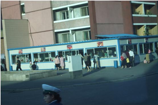 (公路边开始有了摊贩) 平壤市内的商店尽管还都是国营的,但已经有了几条商户集中的街道,其中一条据导游讲当地人称“香港街”。高等艺术学院附近的路边小区旁有了一排简易房,是平壤第一条小吃街,尽管没机会下车品尝,但窗沿上的招贴画和隐约可见的厨师和香蕉、煎饼,络绎不绝的顾客都让我确认这不是装样子给人看的。火车站旁的荣光大街是饭店最为集中的地方,所有饭店临街的窗户下半段都是毛玻璃,但到傍晚仍能看见里边没有餐布的木桌旁围满了食客,闹哄哄烟雾缭绕的样子告诉我们,平壤市民已经开始有了私人社交的夜生活。