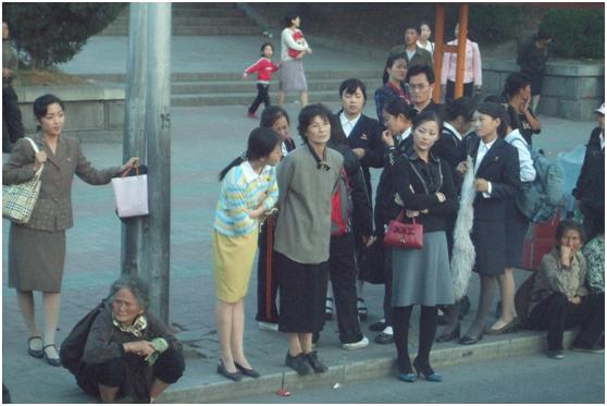 (平壤火车站前的广告牌) 街头景象的变化 一天的晚饭后,我和旅伴趁着导游和其他人正在和餐厅表演节目的女服务员对歌合影的空当,晃悠出来在街上闲逛。安逸的街道一边是有名的玉流馆,一边是居民楼群。我们丝毫没潜入禁区的感觉,尽管破了洞的浅色牛仔裤很容易就暴露了身份,但并没有人阻挡我们,甚至都没有招来太多关注的目光。居民楼临街的一层有餐厅也有商店,商店里摆着烟酒和以前国内杂货店卖的那些暖瓶脸盆塑料玩具学习用品之类,专门的食品店有饮料和面包出售。街上的人们神情轻松衣着也不错,甚至还碰到个遛狗的女人。如果不是一楼房间里高悬的二金头像提醒,根本与国内社区没太大差别。 下面的照片是个公交站上等车的人们。请看那位拎红色手袋的黑衣女子,哪有一点北朝鲜女同志的风貌,尽管只是瞬间的表情,但眼睛里流出来的全是妩媚甚至是风情;她身后的女中学生们,学生套裙丝袜和松糕鞋短袜,裙子再短点扔日本就叫卡哇伊了;最左边扶电线杆子衣着黯淡的,人家背的BURBERRY弄不好还是个正品;比比最下方坐马路牙子上的几位前辈……这就叫变化!