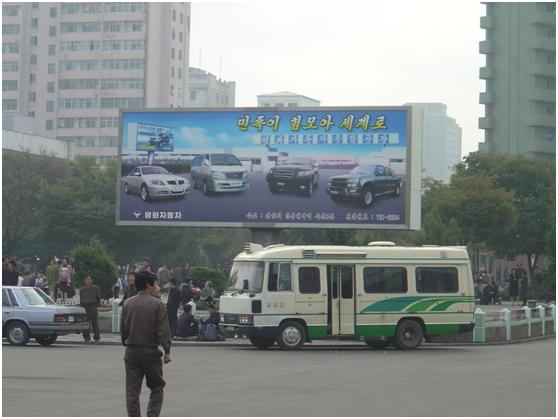 平壤街头的冷饮摊是这个城市的一景,蓝底白盖的摊棚到处都可以看到,里边通常摆着冰柜、雪糕箱和冰激凌机。一次找到机会冲过去买东西,语言不通加上紧张的关系,指手划脚半天干脆丢下20块人民币买了两个PET瓶的饮料,一瓶类可乐一瓶类芬达,味道嘛模仿得还真挺像。 有关商业的变化最明显的莫过于平壤街头出现了广告牌,火车站前和进城的两条公路旁,那些以前为太阳万岁和打倒美帝预留的位置上,树立起了朝鲜国产汽车的广告。要知道即便是80年代中期的北京,我印象还有着二环路内不允许出现商业广告牌的禁令。