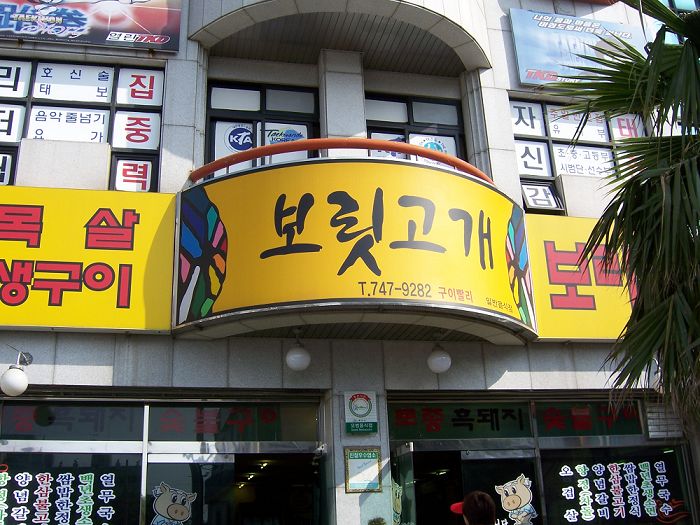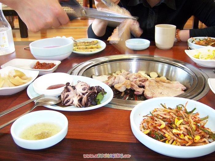 出来时已经3点多了,想起午饭只是吃了面包,决定不亏待自己.去寻找传说中的"大麦丘陵".应该是离新罗不远的.在问了N个人,路过E-MART后再走差不多10分粥后,终于见到了"大麦丘陵".大概是时间的关系,店里一个人都没.怯怯的问了下是否OPEN,得到肯定的答复.于是开始点菜.烤黑猪肉是必不可少的,本来还想点猪颈,但老板娘说我们吃不完.所以就点了2人份的烤黑猪肉.首先是上来很多配菜,泡菜饼、章鱼、各种素材的泡菜,很多。然后是烤黑猪肉,是用剪刀剪的,肉很香,看上去很油,但烤好后包在生菜里味道还是很好的。