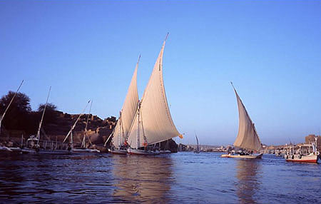帆船之旅 参观完阿布辛贝,我们登上了前往卢克索的帆船(Felucca)。尼罗河上白帆点点,美丽而浪漫,而船舱甲板就是一个铺着被褥的大通铺。我们十几个来自各国的男男女女有幸聚在一条小船上度过一日一夜的尼罗河之旅。船长穆罕穆德是个沉默寡言经验丰富的老人,他的儿子子承父业在船上打杂。我们白天坐在船上,喝着当地的星牌啤酒,沐浴在灿烂的阳光下,看着静静的尼罗河水、两岸的山坡绿树和小村落从身边滑过;傍晚,帆船停靠在努比亚村旁,我们结伴到村中。 村里生活条件很原始,土坯房,黑黑的村民带着憨厚的笑接待我们。我们借用了一户居民的厕所,作为回报想买一些吃的,他们到处搜罗,只找到一些当地产的巧克力和饼干,我们买下一些和村民一起享用。 一对从美国来的小姐妹,参照LP(Lonely Planet)的指示,请当地人做手绘(Hanna)。一位年轻的妇女跟随我们到了船边,坐在小山坡上认真地工作。她先用一种黑色的膏状物体像挤牙膏一样在手背和胳膊上画上图案,等干后拿掉,然后用一种透明的液体氧化剂涂一遍,皮肤上立即变出黑色醒目的图案。姐妹两个十分满意,劝我也做一个,考虑到回国要马上上班,而图案要一个星期后才能逐渐褪色,我就拒绝了。我心中十分奇怪,难道美国护士允许这样的装扮上班? 晚餐是船员准备的当地的饼、蔬菜、辣酱和果酱。 夜幕降临了,船长指示儿子在沙滩上为我们点燃了篝火,这个节目真是出乎每个人的意料,大家高兴极了,撺掇船员为我们表演当地的歌舞,中年人大方地为大家跳起了舞蹈,伴着有节奏的鼓点。 夜渐渐深了,夜幕下,来自尼罗河的夏夜的暖风轻拂着脸颊,呷着冰凉的啤酒,嗅着湿润清新的空气,大家三三两两地聊着。一对从欧洲来的小两口向大家交代情史,大家纷纷惊讶着这么年轻漂亮又先锋的一对居然已经正式结婚了。 半夜,大家纷纷在“大通铺”上找个位置,倒头就睡。几个美国人钻入了自己带的睡袋,看来是有备而来;我则和衣而卧。早上,听到水流的声音,感觉船在轻轻摇摆着,睁开眼,船已经开始航行。忽然发现身上多了条毛毯,睡在旁边船尾舱下的老船长默默地把自己身上毛毯的一端搭在了我的身上……