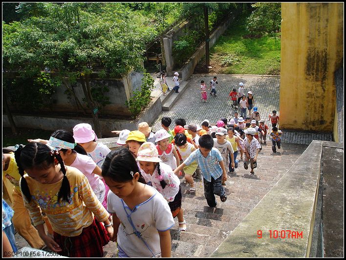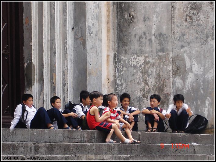 拐进一座类似以前的炮台改造的建筑(糟糕的记忆已经忘记了名字),不过已经杳无人烟。可能以前是政府的办公地点,空落的房间里还有宣传画,久违的宣传画。 历史在那里沉淀成安宁清幽。 就我们两个人在那里舒缓的游走,看不知名的花朵恣意渲染着夏季的活泼。看沉甸甸的果实点缀着废园的至静至美。片刻的良辰美景,稍纵即逝的微温清凉,叫人难以忘怀。 正在炮台上取景,就听见远远就传来了一些轻快的叽叽喳喳的声音,似乎小鸟的呢喃,声音越来越大,好奇地往下一看,哇,有很多很多的孩子排着队走进来,打破了这古老的宁静,很快园子里充满了孩子们稚嫩的童音,干净明亮的笑声。孩子,永远是我镜头里的主角,在这个废园里,在大教堂外明媚的阳光下,在路边的小吃摊上,我忍不住拍了又拍,男孩子憨憨的笑,女孩子羞涩的笑,成为记忆中最亮丽的风景。 在河内还有一件事不会忘记。 最后一夜,逛也逛了兜也兜过了,回到旅店已经是晚上10点多了,因为第二天一大早的汽车到南宁,就忙着收拾行李,突然整个房间一片漆黑,竟然停电了。和剑不由面面相觑,赶紧去找那个“No problem!”店主,这回他可无法“No problem!”了,拿个电筒左看右看后耸耸肩来了一句sorry.这下我们可急了,行李没收拾好,也没有洗澡。换房间吧,他却跟我们说已经没有了。不过他说他兄弟那里有房间还可以便宜一点云云,又是“No problem!”。已近午夜了,实在也没心思再折腾了,于是也就答应下来了,谁知在跟着一个小伙子走过了几条漆黑的巷子后看见的竟然是一个破旧黑暗的小旅店,且漫天要价。心里的火一下子就冒出来,敢情什么兄弟就是随意找的一家啊,难怪在我们临出来时他一定要结算了前一天的房费,想起刚到河内的时候遇见一个旅居法国的老人,他在河内住了一个月即将离开,他很愤慨的对我们表示这里的人没有诚信。现在算是领教了。 我和剑的倔脾气都上来了,我们宁肯一夜在街上徘徊也不愿意住了,于是又背起沉重的大包走到了街头,午夜的河内老街区已经空空荡荡了,偶尔有一些面目不清的人在闲荡,根本就不知道在什么方位,不得已只能叫了一辆的士把我们载到old quarter最热闹的地方,这次我们是看门面敞亮,外国人多的一家GH进去了,前台的小伙子说要25美金一间,当听说我们是被骗了而且次日一大早就要离开河内的时候,就慷慨的降到了18美金,于是子夜时分,我们住了本次柬越行最豪华的房间。