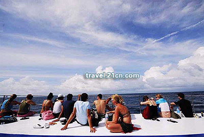PP岛的惊喜 既然来看海,就不能不去PP岛。通过酒店订船票,不仅能打折,而且酒店还派专车来回接送,了却了不少的麻烦。到了PP岛才知道什么叫海水。海水是透明的,只是因为反射海底,所以在不同的角度呈现出淡绿、深绿、淡蓝、深蓝的色泽。船靠岸时,码头上一大群五彩鱼在水底静静地游弋,水的清澈让人咋舌。在船上我们就预订了酒店:PPHOTEL海景房,2200铢。酒店就在码头边上,一下船就有酒店派来的工人帮我们搬行李,不过这家酒店的退房时间居然是中午11点前,不是不怪异的。上了岸才发现似乎整个欧洲大陆的老外都来到了PP岛,海滩上、街道中、酒吧里,摩肩接踵的都是一口洋屁的老外,只有10%的才是当地人和一些东南亚的游客。所以那个瑞士的小P孩得意地说:在这里,你们才是老外,晕倒!PP岛上的生活变得非常悠闲,我最喜欢的便是大清早起床,坐在海边的凉棚里喝着冰可乐,然后静静地看阳光慢慢把大海染出各种颜色。既然到了PP岛,就少不了雇船出海,那些个有三架引擎的“大飞”(SPEEDBOAT)价钱巨贵,心痛囊中羞涩之余,终于在中午人少时分逮到一艘木船,说好600铢出航(一般需要800铢)。乘风破浪到达MAYABEY时,“PP归来不看海”的神话终于出现,言语难以描绘那个海的美丽,所有人都会情不自禁地跳进海的怀抱,什么也不说、什么也不想,就这么泡在水里,似乎时间都已经消失,原来这里就是传说中的“天堂”。