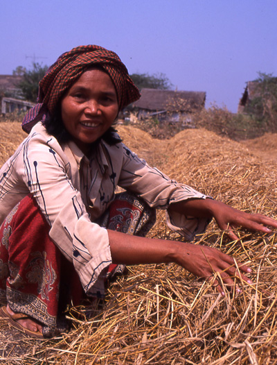沿着6号公路你可以一直到达柬埔寨今天的首都金边。据说在去金边的6号公路上也有很多类似的石桥,不象这座桥已经废弃了,那边的石桥还在使用中。他又带我们穿过一小块田地来到河边观看一个巨大的木质水车,有工人正在维修。那耐心地讲解水车的功用并自豪地夸赞柬埔寨任命的聪明才智。