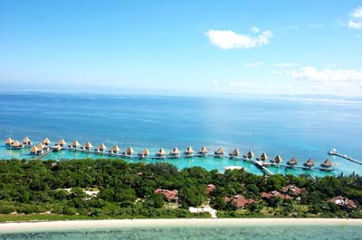 最有趣的还要说是到深海里喂鲨鱼,我们的船开到外海深蓝色的地方,先是向水里扔面包,有数十条小鱼游来争先恐后抢食,十分钟后游来几条大的颜色鲜艳的大鱼,它们并不吃面包,它们只是围着船游动,突然小鱼一阵骚乱,原来这些大鱼是吃小鱼的。不一会儿,海底又游来一些更大的家伙:鲨鱼。它们先是几条,它们来吃那些吃小鱼的鱼。船上的工作人员看到有鲨鱼出现,就将大块的鱼肉用绳子拴好放入水中。 一会儿工夫就有十几条鲨鱼在水中争相抢食。大鱼吃小鱼,看得人心惊肉跳,我问船长这里的渔民就是用这种方法抓鱼的吗?船长笑了,说:“这里的人们抓鱼没有这么费劲,这里的海产十分丰富,人们只是在珊瑚礁70米的外围围上堤坝留一个小口,当涨潮的时候,潮水会将鱼冲进堤坝。落潮的时候鱼就找不到出去的小口只能在珊瑚礁上搁浅,这时人们只要拿着渔叉就可以捕鱼了。”我的老天! 在岛上有许多度假的小屋,外面是茅草,里面设施齐全可以称得上豪华。在午餐的时候,还能观看当地人的歌舞,有些像夏威夷的草裙舞,传统的辟娄(pilou)舞表达关于出生、婚姻、飓风、备战的故事,殖民主义当局在1951年宣布禁止,理由是该舞蹈很费力气,而且使舞蹈者陷入梦幻状态。