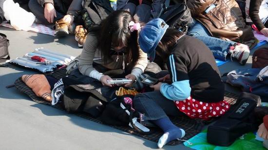 这是在迪斯尼乐园里面,席地而坐等待圣诞迪斯尼游行表演的人们(游行照片在游记篇),看到姐妹两个,对身旁的事充耳不闻,埋头苦干的联机dsl......随后在另外一个厕所门口,看见一个等人的大叔低头玩着脑白金,完全不用触控笔,就拿手指。至于PSP。。。真的没看见,可能全都在地铁里吧