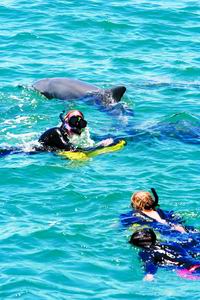 在温暖的海水里,和海豚亲密嬉戏。