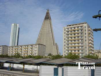 来到朝鲜,你会在人们的日常生活中发现很多相同的数字,如“70”、“216”等等。不要以为这是巧合,这些数字表达了朝鲜人民对领袖的无限崇敬和热爱。 建筑物里融崇敬 就拿建筑物来说吧,朝鲜很多建筑物有特殊的政治意义,而蕴含在建筑物设计和施工中的一些数字,更是直接表达了对领袖的崇敬。 主体思想塔是为庆贺金日成主席70寿辰而修建的,于1982年4月15日金日成主席诞辰70周年之际落成。主体思想塔塔身150米,塔顶部的火炬高20米。这个重达45吨的火炬用特殊天然燃料着色,在白天十分鲜艳夺目,在夜间更会自上而下闪亮,犹如一团熊熊燃烧的火焰。主体思想塔前,树立着一尊高30米,重33吨的群雕,是工人、农民和知识分子三人立像。他们高举锤子、镰刀和毛笔,作前进状,象征朝鲜人民在劳动党领导下奋勇前进。 主体思想塔是从底部向上一层一层用精雕细刻的天然白色大花岗石砌成。如果仔细观察,就会发现,塔身的前后各砌成18节、左右面各砌成17节,共计70节。这象征了金日成主席的70寿辰。70节石层总共用了25550块花岗石,这个数字正是70年天数的总和。70和25550,表达了朝鲜人民对金日成主席70寿辰的祝贺之意。
