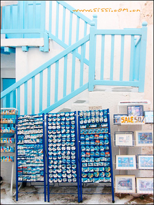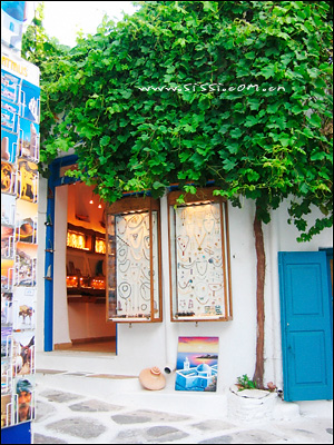 Mykonos的小镇有一些村落的感觉,窄窄的小巷,弯弯曲曲的,两旁都是白房子和蓝色的门窗,街道比较干净,用石板铺成,石板之间也被刷成了白色。由于小镇的规划没有什么规律,书上说十分容易迷路,不过小镇本身就不大,再怎么复杂都还能走出来,呵呵。小镇里面到处都是小的店铺和酒吧。很多店铺布置的很有格调,卖的东西也很漂亮,让人爱不释手。