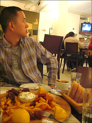 晚上,我们在所住Studio附近的一家餐馆吃饭,里面当地人很多,事后比较下来,发觉这家餐馆在岛上价格很实惠,第一天吃饭的两个地方居然都是最佳选择。我们点了一盘大份的Mixed Meat、一杯Greek Double Coffee和一杯水。咖啡的杯子不是很大,和我们在国内的那种一样,不过里面放的咖啡粉实在是太多了,不仅表面上漂浮着一层,底下还有厚厚的一层,真想让服务员给我续一些白水。Mixed Meat的份量也出人意料的大,我们最后勉强吃完了肉,但炸薯条就没怎么动。