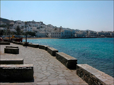 然后沿着沙滩一路往小镇逛过去。 在港口附近买了2个面包,坐在椅子上吃个“海景餐”。然后继续前行,先在旅行社买了9月23日中午去Santorini的船票,同时问了一下Fira和Oia的酒店的价格,工作人员告诉我们凡是建在悬崖上可以看到海景的酒店,都在100欧元以上,不过事实证明,旅行社关于酒店的价格从来都是超出实际情况不少。