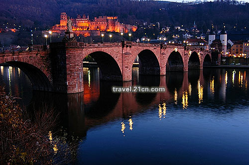 然而我的心确实失落在了海德堡,或者说得更确切些,是失落在了那些美丽的德国小城。对于一双看惯了一千三百万人口的都市风光的眼睛而言,巴黎般的繁华并没有想象中的那么令人震撼,倒是海德堡、特利尔这样的小镇,却描绘出了我对天堂的所有幻想。 海德堡——心失落处 从蜿蜒、静谧的内卡河边就已经可以望见高耸山间的古城堡了,但是不要心急,先顺着石块铺就的小路去海德堡的老城(Alte Stadt)里走走吧。请一定不要穿高跟鞋来这里,因为只有整个脚掌都落在这凹凸不平的古老石径上,才能契合这里闲适安心的节拍。街边的每一幢房子,无论是民居还是商店,所有的阳台上都开满了色彩鲜艳的小花,深红的、粉红的、紫红的,单看并不起眼,可一丛丛、一簇簇地绽放在光鲜的阳光里,就是那么地赏心悦目,叫人情不自禁地露出笑容来。 龙应台有本颇煽情的小说叫做《在海德堡坠入情网》。作为一名海德堡的过客,要见证坠入情网的过程恐怕很难,但运气好的话,倒可以见证到坠入情网的结果。我们在市政厅门口就遇上了一对前来登记结婚的新人。新郎一身米色西服,新娘红衣白裙,均羞涩而优雅地向祝贺的路人频频报以微笑。而在这样美好的气氛里,所有经过的路人,即使素不相识如我们,也都按捺不住内心的感动,纷纷上前向这一对璧人致以诚挚的祝福。 沿石径一路向上,就来到了最著名的古城堡(Schloss)。这座身形伟岸的城堡据说始建于12世纪,其间经过几次扩建才形成如今哥特式、巴洛克式和文艺复兴式三种风格的混合体模样。古堡历史上曾是选帝侯宫邸,但在17世纪末遭到法王路易十四拓展版图的军队的攻击,几近全毁。然而在游客眼里,这古堡的废墟却似乎更加让人着迷。城堡的正面保存得尚属完整,那褚红的墙、古旧的窗,依然透着中世纪的不朽风韵;城堡的侧面则好似古罗马竞技场一般,只残留着健硕的墙体骨架。窗洞还在,可所有的精致细节都早已无从寻觅。两相对比,却更教人心中感念,唏嘘不已。 古城堡的背后有个宽大的平台,那里是俯瞰海德堡全景的最佳地点,整个大学城一览无遗。我们去的时候正值暑假,如果在学期中前往,就能看到无数青春飞扬的学生身影,与周围古老的城区相映成趣,也是一道十分独特的风景。在平台的石地上还能找到一个深陷的脚印,据说当年古堡的男主人外出打仗久未归,年轻的女主人便在城堡里与情人幽会。此时忽闻男主人战胜归来,慌乱间情人便从窗内跃出,一脚落在此平台上,第二脚便跃入山下的内卡河逃命去了。名为传说,其实多为后人杜撰,无非是给这古堡添加些香艳的色彩,供人消遣罢了。 与此相比,我更喜欢关于那个关于古堡酒桶的传说。踏入古堡的地下室,迎面便是一个直径两人来高的大葡萄酒桶。不过这只能算是小巫,再往里几步你就能看到迄今仍保持世界纪录的最大酒桶(Das grosse Fass)。这个18世纪制造的庞然大物足有两层楼那么高,容量超过22万公升,你可以顺着专门修建的木楼梯一直爬到酒桶的顶上,想象一下当年城堡内贵族们花天酒地的生活。酒桶对面的墙上有一小尊手执酒杯的木制人像。据说他本是酒窖的看管者,主人再三叮嘱不得偷喝桶中的美酒,但他某日终究按捺不住,便偷喝了一杯,不想却就此醉死在桶边。后人于是在这儿塑了他的像,让他可以岁岁年年长伴美酒左右。 古堡里还有一间医药博物馆,其中有间配药室模样颇似中药铺子,只不过中药铺子里满是一格格的小抽屉,这里却是一架子一架子的小瓶子。还有一间长得好象老式的实验室,里头有各种奇形怪状的玻璃器皿,据说都是提炼药材用的。古堡花园的入口还有一座拱门,名为“伊丽莎白门”。传说是古堡的选帝为了祝贺他的妻子伊丽莎白的20岁生日,命人在一夜之间修建完成的。都说德国人生性古板,由此看来却似乎比法国人更加浪漫多情呢。 一路又从古堡回到山下,内卡河上的古石桥(Alte Brucke)正是最美的时候。这座九拱石桥迄今已有近150年的历史,红白相间的双子桥头堡更是令人过目不忘的美景。桥旁有尊手执铜镜的猴子铜像,据说这只猴子自以为是天下最美的猴子,所以频频顾镜自赏。我却禁不住疑惑,这难不成上演的是《白雪公主》的猴子版么?猴子的头部是镂空的,只要愿意,你也大可以把自己的脑袋伸进去自恋一把。 从老桥过河,沿山坡拾级而上到半山腰,就能找到一条幽静的林荫小道,因为歌德和黑格尔当年都曾常在这里散步,思考哲学问题,这条小道由此得名“哲学家小道(Philosophen weg)”。小道旁的一个花园门口竖着一支向上平伸的手掌模型,掌心里写着简单的一句话:“Heute Schon Philosophiert?”直译过来就是“今天你哲学过了吗?”