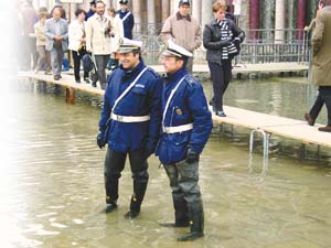 广场边上的圣马可教堂、大公府博物馆院子里都已经浸水,人们踏着过桥出入教堂和大公府。据陪同我们的当地官员介绍,市政府根据威尼斯的地形图,在所有地势低的地方都准备了人行过桥,平时这些桥架与桥板都堆放在一起,大水来时,便会有市政工程队的人员负责将它们架好。过桥最高不能超过50厘米,这是国家法律规定的,超过了就需安装护栏,这是为了保障行人的安全。但小巷子里就不可能摆放过桥了,要想进去只能穿高筒靴。