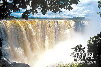 非洲南部河流赞比西河从津巴布韦流往赞比亚,在两国边境处遇到一个宽阔而深邃的峡谷而形成了维多利亚大瀑布。1855年英国探险家利文斯通深入非洲内陆探险发现了这个巨大的瀑布,便以当时的英女王维多利亚的名字命名了这个瀑布。瀑布落差约120米,宽1800米,在世界排名第二大。由于瀑布流入峡谷,流水撞击峡谷而冲起高高的水雾,我们在10多公里外便可以见到,只见到在开阔的丘陵地带中有一股水雾冲天而起,且隆隆之声可闻。