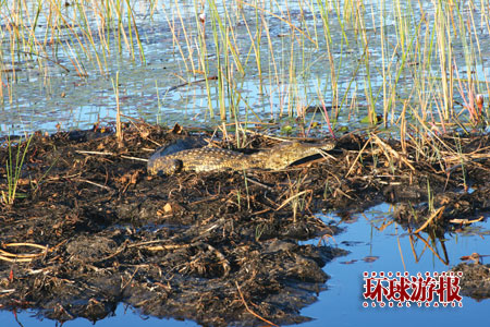 独木舟换成摩托艇 下午的安排本来是要划独木舟的,由于时间的关系换成了摩托艇。在我们驾车驶往码头的时候,经过了几个很深的池塘,水深的都没过了司机的膝盖,Land Rover也真争气,几乎是“游”过去的,在我们在非洲的日子里,还从未发生过一起熄火事件。 驾着摩托艇在弯弯曲曲的河道里游荡,我怎么感觉像在中国的白洋淀里一样,夕阳把芦苇丛变成了红色的高粱地,一只小鳄鱼让我忘记了白洋淀,这确实是在非洲。小鳄鱼趴在一堆泥土里,一动不动,突然钻进水里消失了,我说怎么没人在这么清澈的水里游泳呢,因为下去就上不来了。 这里的鸟儿很多,五颜六色的,根本叫不出名字来,除非你是动物学家,老鹰在我们头顶飞来飞去。 归途时已是夜幕降临,车的周围又有许多小红点,那都是动物的眼睛,全身红外线的,由于尿急也顾不上细看,归心似箭。 非洲,世界的中心 在Okavango三角洲只有短短三天时间,却看到了我向往已久的野生动物,Okavango的日出日落我将终生难忘,所有的一切都让游客流连忘返,中国有句名言,不到长城非好汉。长城固然好看,可几千年立在那里一动不动,而非洲展现给我们的完全是另一种景象,我们看到的是蓬勃旺盛的生命。