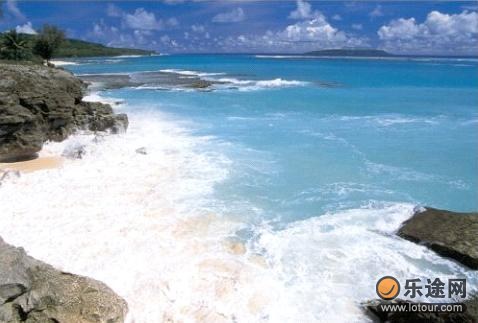 第四天下午到塞班岛观光。吃完午饭就上船,这回是白天,因此我还是坐在略靠船头的地方,可是不久我就知道错了,感觉到心胸还是不很舒服,于是边忍着边看看外面的景色。在晴朗的阳光照射下,海水很蓝,有一种不知什么名称的小鱼,忽地突然从水中窜出来,箭一样在海面上飞了很长一段距离,又突然没入水中,很特别。 好不容易到了塞班,下船坐车环岛游。游览地方多是二战遗迹,如日军司令部、自杀涯等等,我一向对日本鬼子特别没有好感,看了这些遗迹和听了导游介绍日军的残暴,不由得产生了一股气愤情绪,破坏了出来旅游愉快的心情。好在还看了两处自然的风光:鸟岛和蓝洞,心里稍为平静。蓝洞其实就是岛上一个与海相连的钟乳石深洞,洞里的水很蓝,湛蓝得象猫眼一般,因此称为蓝洞,这可是潜水爱好者潜水的地方。鸟岛是一个小海湾前的一个孤岛,据说以前岛上海鸟很多,因此得名,又据说小岛很象一对正在亲密的海鸟,因而也称为情人岛,据导游说这里的原住居民喜欢到鸟岛上谈清说爱,导游接着又介绍许多这里的风土人情,又教大家说了几句问候的土语,我只记得当地人招呼别人的一般手势,食指、中指和无名指紧握,拇指和小指伸直,如果拇指和小指伸直之外,再伸多一个手指,那就是“I love you”的表示,导游还反复强调别搞错了。我到了鸟岛一看,没有很多的鸟,也没有象鸟,只是站在悬崖上往下看,从浅到深的海水在阳光照耀下,颜色也从浅蓝色到深蓝色