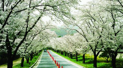 庆熙大学的樱花路 庆熙大学让人觉得是个旅游胜地,建筑物古色古香,校园美丽。夏天的时候,数千棵大树绿树成荫,春天则是樱花的海洋。特别是从正门到本馆的路,路边的樱花著名。每年4月,200多棵樱花树鲜花绽放。在本馆前面的湖边可以尽情感受春天的气息,周围的树林和开满鲜花的草地是恋人们喜欢去的地方。沿着湖右边的山坡上去,就是通往师范大学的散步小径,也非常美丽。茂盛的树林里有幽静的小路,雅致的小桥和流水。 交通:乘地铁1号线在回基站下车,步行10分钟即可。 镇海樱花海洋 镇海种有22万多棵樱花树,一到春天,这里就成了樱花的海洋。整个镇海市区都是看樱花的胜地,其中最著名的是安民路、海军基地司令部、帝皇山公园。安民路长5.6公里的樱花路,平时也很少有车辆通行,是人们喜欢的散步路。海军基地司令部有很多树龄老的大樱花树,这里只在军港节期间对外开放,除了看樱花,还能欣赏到和实物一样大小的龟船。军港节期间,可以坐内部循环巴士游览参观司令部,大约需要10-15分钟;如果步行的话,只能看一部分,需要20分钟左右。在帝皇山公园,可以俯瞰镇海市区的樱花和附近的大海。爬一年台阶––因为一共有365节台阶而得名,可以观赏到路边绽放的樱花和迎春花。