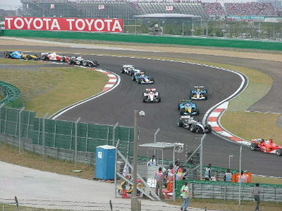 今天万里无云的天上飘着朵朵白云,我们怀着激动的心情前往上海国际赛车场去观看闻名世界的F1比赛。原先打算借个车去的,报纸上报导没有停车证的车辆要停在赛场的外圈,走到赛车场要一个多小时,就决定去上体馆乘直达巴士。9:55到达上体馆,随着人流来到了巴士乘坐点,人非常多,不过车也很多,所以只等了不到10分钟就乘上了车。11:00到达赛车场,真大。不过赛车场的检票不太紧,我们的票子是两张联票,昨天本来想让别人去的,但是他们怕带个小孩不让进,就没去,太可惜了,应该可以带进去的。进场之后,正好碰到车手巡游,急忙架好三角架,拍了几张。然后去商品区,一路上外国