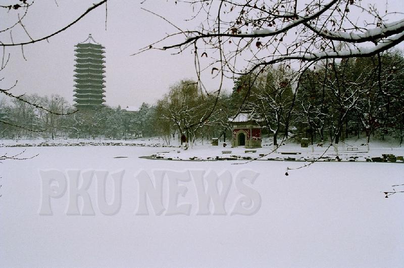 第一次当我来到北京大学时,我看见的是一个银装素裹的世界。在这里,我感受到了一种心灵的沉淀,真正的一种民主的气息。漫步在未名湖边,四周是一种宁静,只听见时而传来的读英语的声音,却又不那么真切,在这种环境中,让人不自觉地放轻脚步,压低声音。望着结冰的湖面,博雅塔的倒影终于看不见了,只有湖边那附雪的身影,白白的,无法说情心中的感受。其实在北大,最重要的不是看景点,而是感受那种从心底溢出的东西,感受北大自身的文化底蕴。那是经过百年的沉淀和积累,是无数北大人思想的荟萃。景点: 1。北大西门——经常在电