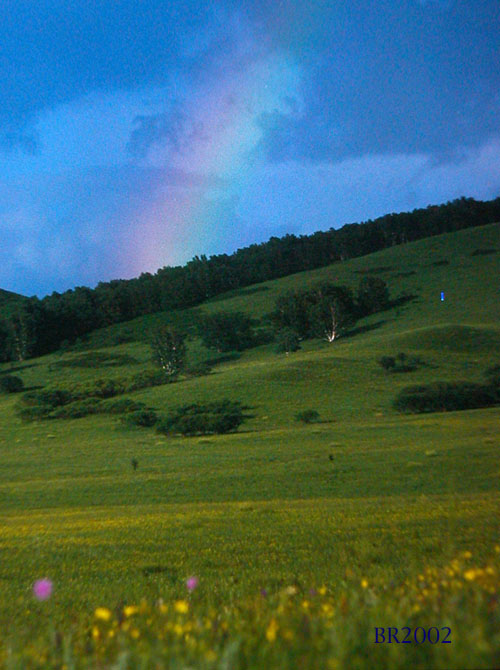胡言乱语 围场坝上之不拿下题记:这个夏日,兔子捣了把乱,混进一群互 相昵称大师的队伍里踏上了丽日下的草原。 大道奇的车上有个娃娃同行,乳名唤作小 熊,只要是看见前面有阻挡道奇行进的车子, 就嚷着从不变化的豪言壮语:“大大,拿下”, 然后督促着他可爱的大大超车而去,留下一路 滚滚尘烟。至此,在一路行程之中,我们对遇 到的所有问题也都有了应答:“拿下!” 究竟拿下的是坡上的浮云?是草滩上空的 双虹?还是那摸将军泡子外的金色霞光?相信 大师们都有答案,但他们并不知道,兔子居然 还是喜欢上了拿下之外的生活。。。 **************************************** 不拿下之镜头一: 漫坡的野花,多数是粉紫和浅黄,细细的 寻觅,能见到五瓣的纯蓝色,不多,带着铃兰 一样的骨朵。阳光让他们执著,执著自己原本 的颜色。 兔子喜欢这样的执著,或者根本就依赖这 种颜色无法自拔。