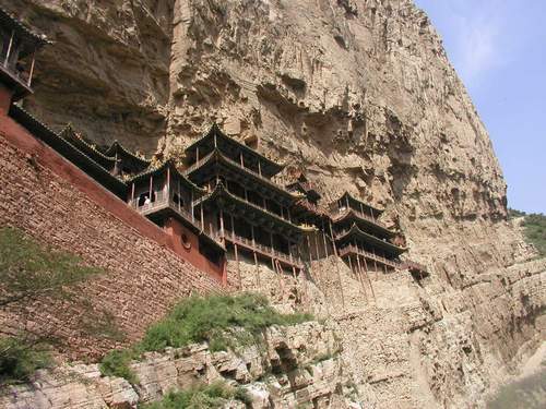五台山—恒山、悬空寺—大同(八)——悬空寺 从恒山出来开车仅几分钟就到了著名的悬空寺,它位于金龙峡口不远的地方,悬挂在峡谷西侧的翠屏峰山腰。远远望去,神楼仙阁,凌空危挂,丹廊朱户,依岩而栖,真让人以为是神仙的居所。 悬空寺始建于北魏,至今已有1500多年的历史,但至今仍然完好,还能让如此多的游人登寺参观,不能不说是一大奇迹。因为寺庙的一半嵌在石壁中,一半悬在半空,靠十几米长的木柱支撑在岩壁上,难怪被人称为“奇、险、巧”的建筑艺术构思。翠屏峰虽突兀直起,但岩壁中部略呈弧形,整个寺院峭立在凹岩之中,而石窟顶峰突出部分像一把天然大伞将整个寺院罩在里边,既避免了风侵雨蚀,又遮挡了太阳曝晒,所以在1500多年以后它还能展示它的雄姿。全寺以木质结构为主,立明柱借岩石暗托,凿洞穴插飞梁为基,它的最高处离谷底百米左右,登到此处,令人惊心骇目。整个寺庙一半悬于岩体之外,下边有